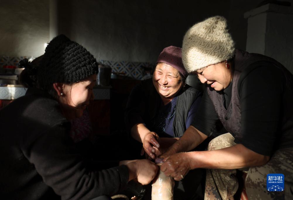 巴哈提(中)和親友在屋內一邊灌裝牛肉腸,一邊拉家常(11月30日攝)。