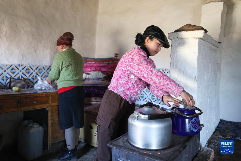 巴哈提的大女兒加孜拉(右)和弟媳&&燒茶、切菜,迎接客人(11月30日攝)。