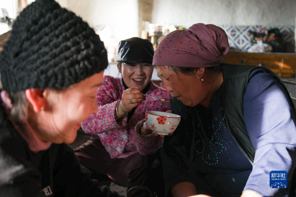 巴哈提(右)和親友在屋內灌裝牛肉腸,大女兒加孜拉(中)盛着剛做好的“胡爾達克”,讓母親嘗嘗味道(11月30日攝)。