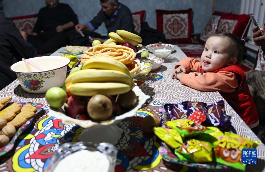 手抓肉上桌前,年長的客人在一旁聊天、打牌,一名兩歲的小朋友趴在餐桌上翹首以待(11月30日攝)。