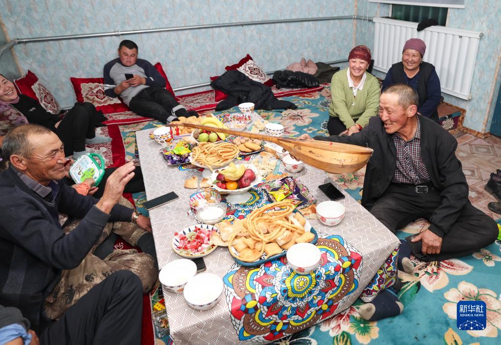 哈布得拉什麼(右)把冬不拉遞給客人(11月30日攝)。