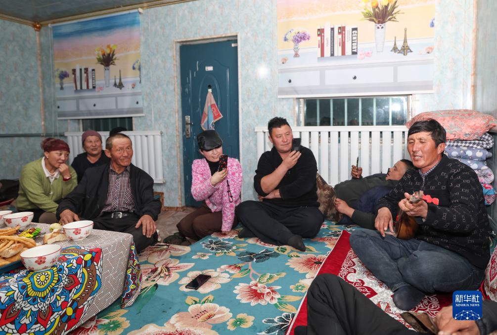 巴哈提的三弟賽力克汗(右一)嗓音清亮,自告奮勇為親友彈唱一曲讚美家鄉牧區的歌(11月30日攝)。