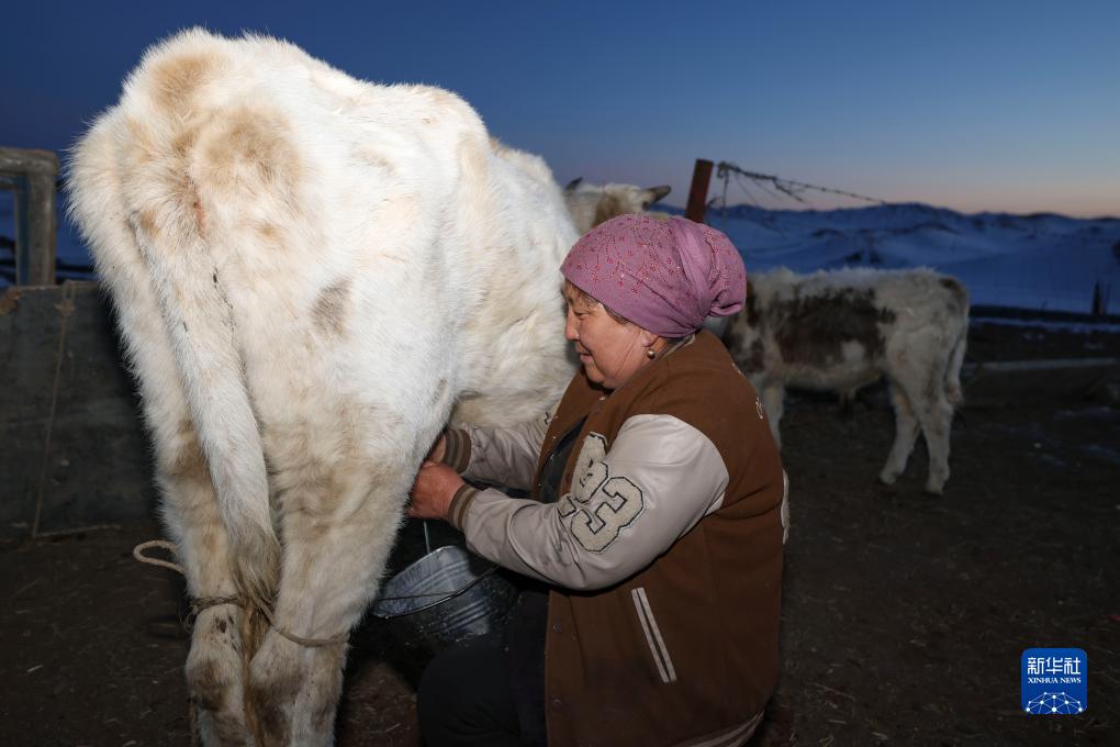 巴哈提在門前小院內擠牛奶,為參加冬宰的客人燒奶茶(11月29日攝)。