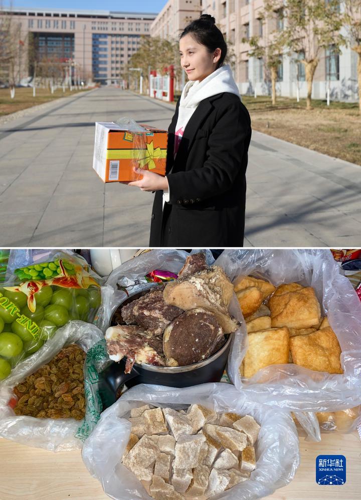 拼版照片:上圖為昆樹阿克在新疆醫科大學(雪蓮山校區)收到母親巴哈提託人帶來的物品(新華社記者胡虎虎12月3日攝);下圖為巴哈提託人帶給女兒的熟牛肉、奶疙瘩、葡萄幹、包爾薩克等美食(新華社發,12月3日攝)。