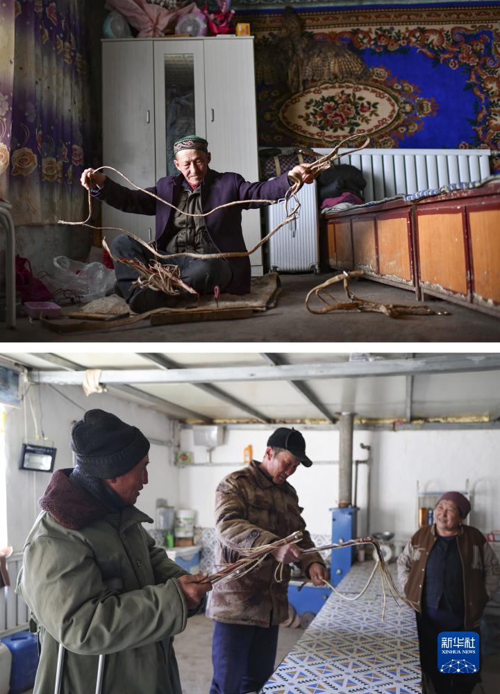 拼版照片:上圖為放牧歸來,哈布得拉什麼在家中用收購來的牛皮製作韁繩等放牧用具,這些用具將出售給其他有需要的牧民(2月11日攝);下圖為兩位牧民來到巴哈提經營的商店,詢問馬鞭子的售價,有意購買(11月30日攝)。