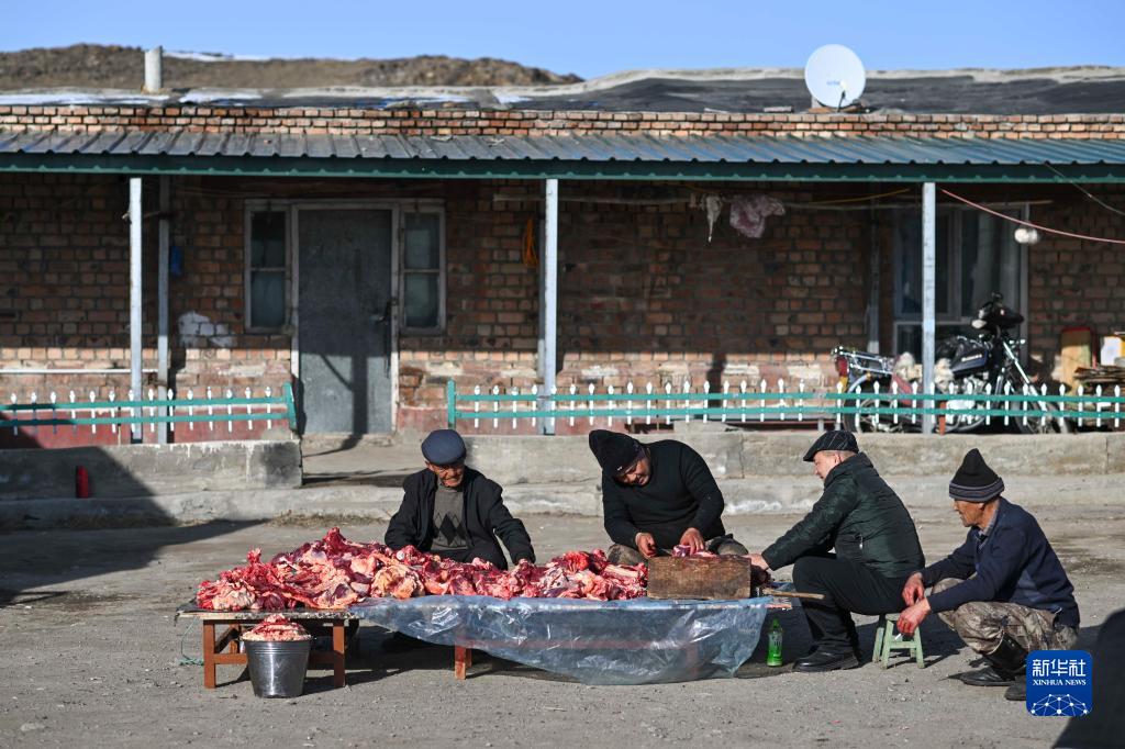 哈布得拉什麼(左一)和親友在屋前小院把剛宰殺的牛肉分割切塊(11月30日攝)。