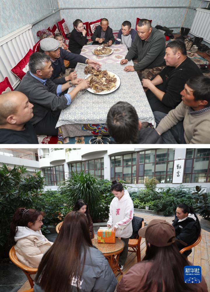 拼版照片:上圖為冬宰後,親友們在巴哈提家中享用手抓肉(11月30日攝);下圖為在新疆醫科大學(雪蓮山)校區的教學樓休息區,昆樹阿克(中)和好朋友分享母親託人帶來的熟牛肉等美食(12月3日攝)。