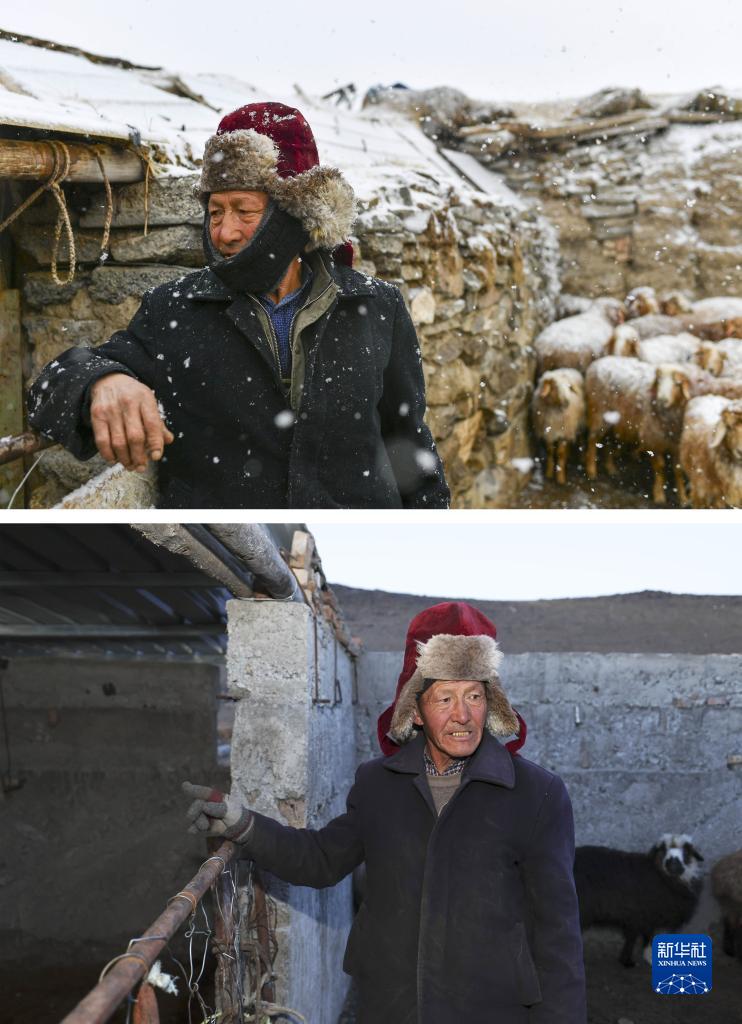 拼版照片:上圖為産春羔時,哈布得拉什麼在羊圈檢查是否有羊羔出生,當時身後的羊圈是土石壘起來的(4月12日攝);下圖為冬季放牧歸來,哈布得拉什麼在羊圈清點數量,此時的羊圈已改造為水泥磚石結構(11月29日攝)。這是今年夏天他家花費約8萬元新修的。