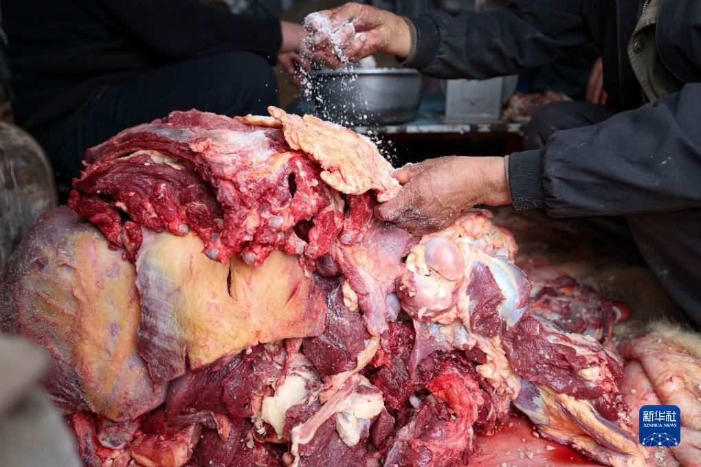 哈布得拉什麼把鹽和蒜瓣撒在分割後的牛肉上(12月1日攝)。