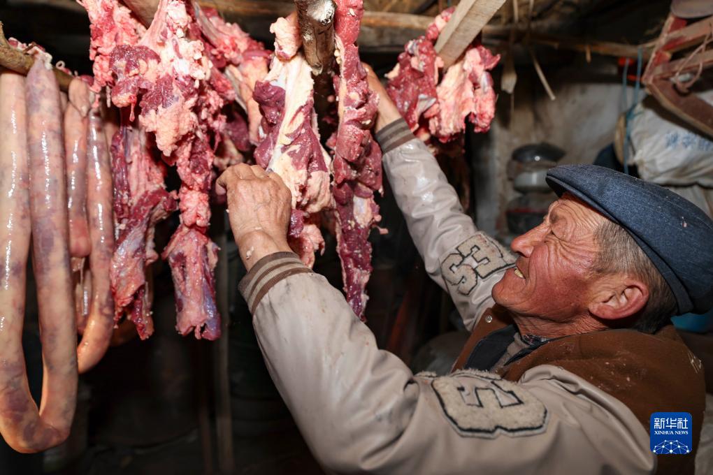 哈布得拉什麼把腌制過的牛肉和牛肉腸擺放到晾架上,靜待風乾(11月30日攝)。