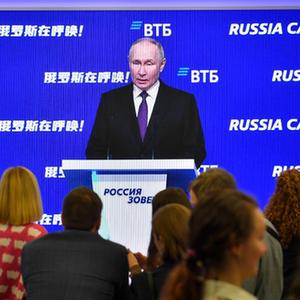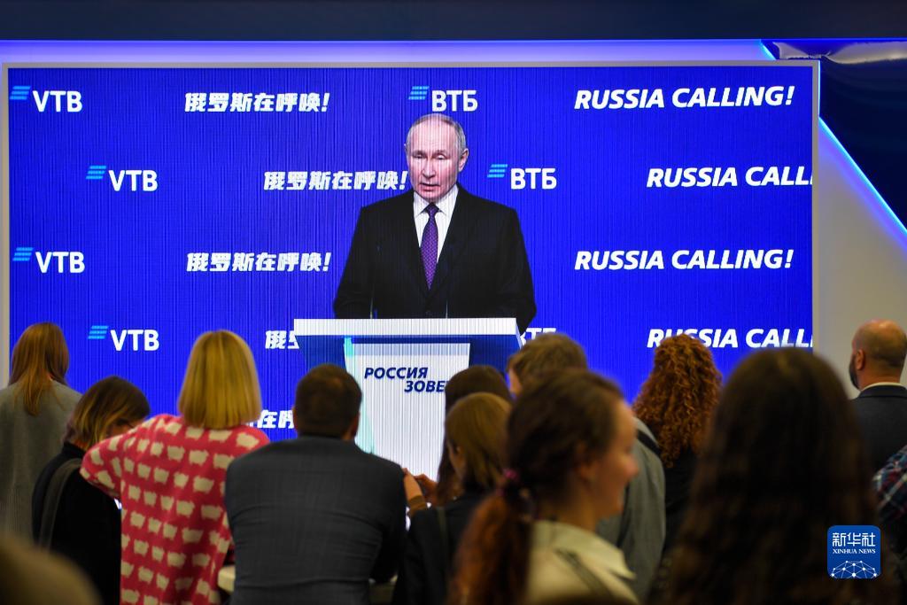 這是12月7日拍攝的俄羅斯總統普京在莫斯科出席第十四屆“俄羅斯在呼喚”論壇的視頻畫面。