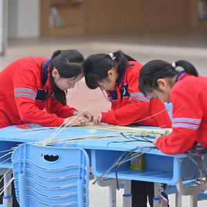 12月8日,梧州市長洲區大橋小學的學生在課堂上編織手工藝品。