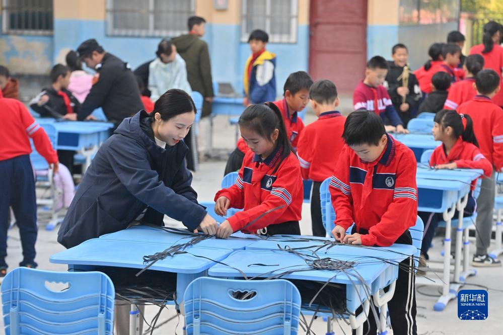 12月8日,在梧州市長洲區大橋小學,梁莉瑩老師(左一)在課堂上指導學生編織手工藝品。