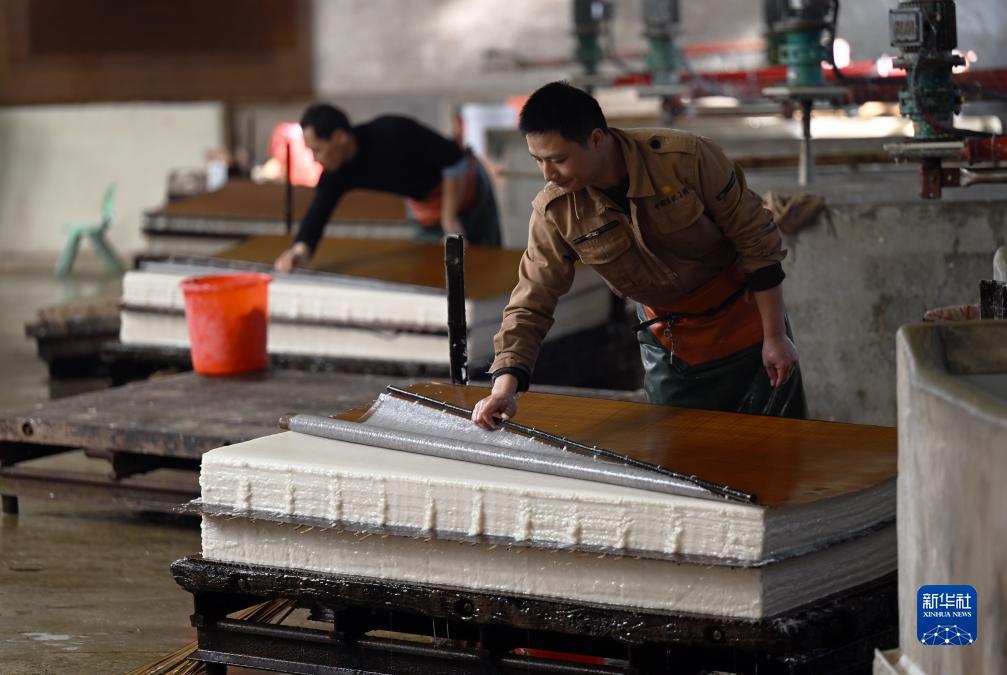 在位於涇縣的中國宣紙股份有限公司裏,“90後”工人已成長為獨當一面的巧匠。撈紙工管家明負責“掌簾”,和同伴相互配合,將竹簾放入紙漿槽,左抄右抄一撈一提,通過手感就能把紙張的重量、厚薄、均勻度控制在最小誤差;在蒸騰的熱氣中,曬紙工吳帆指尖輕捻,將厚厚一疊濕潤的紙張分離,在焙面上把紙張刷平整、烘乾,動作一氣呵成。他們説,宣紙製作工藝有着深厚的文化底蘊,自己還要在工作中不斷精進技藝,希望將來也能夠帶徒弟,把手藝一代一代傳承下去。