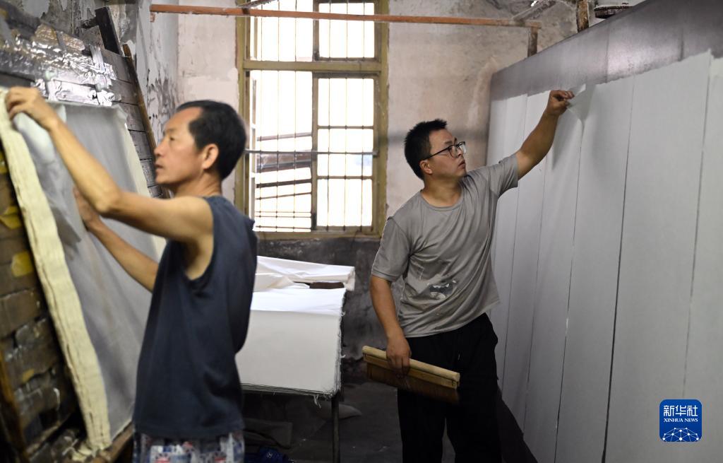 在位於涇縣的中國宣紙股份有限公司裏,“90後”工人已成長為獨當一面的巧匠。撈紙工管家明負責“掌簾”,和同伴相互配合,將竹簾放入紙漿槽,左抄右抄一撈一提,通過手感就能把紙張的重量、厚薄、均勻度控制在最小誤差;在蒸騰的熱氣中,曬紙工吳帆指尖輕捻,將厚厚一疊濕潤的紙張分離,在焙面上把紙張刷平整、烘乾,動作一氣呵成。他們説,宣紙製作工藝有着深厚的文化底蘊,自己還要在工作中不斷精進技藝,希望將來也能夠帶徒弟,把手藝一代一代傳承下去。