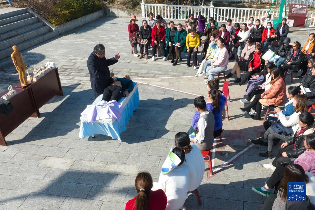 12月7日,中醫艾灸師為蘄春縣青石鎮大屋村村民講授艾灸技法(無人機照片)。