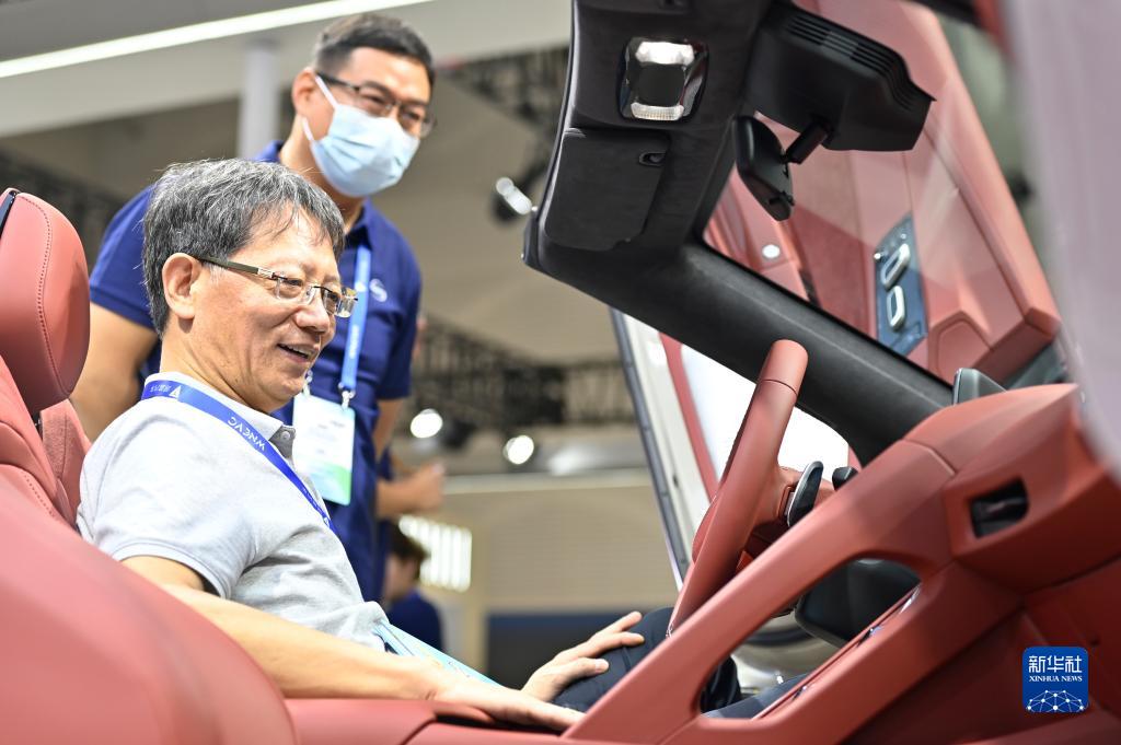 12月7日,在2023世界新能源汽車大會上,嘉賓在體驗一款敞篷跑車。