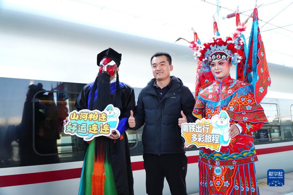 12月8日,在濟鄭高鐵濟南長清站,一名乘客與參加濟鄭高鐵全線開通儀式的戲劇演員一起合影。