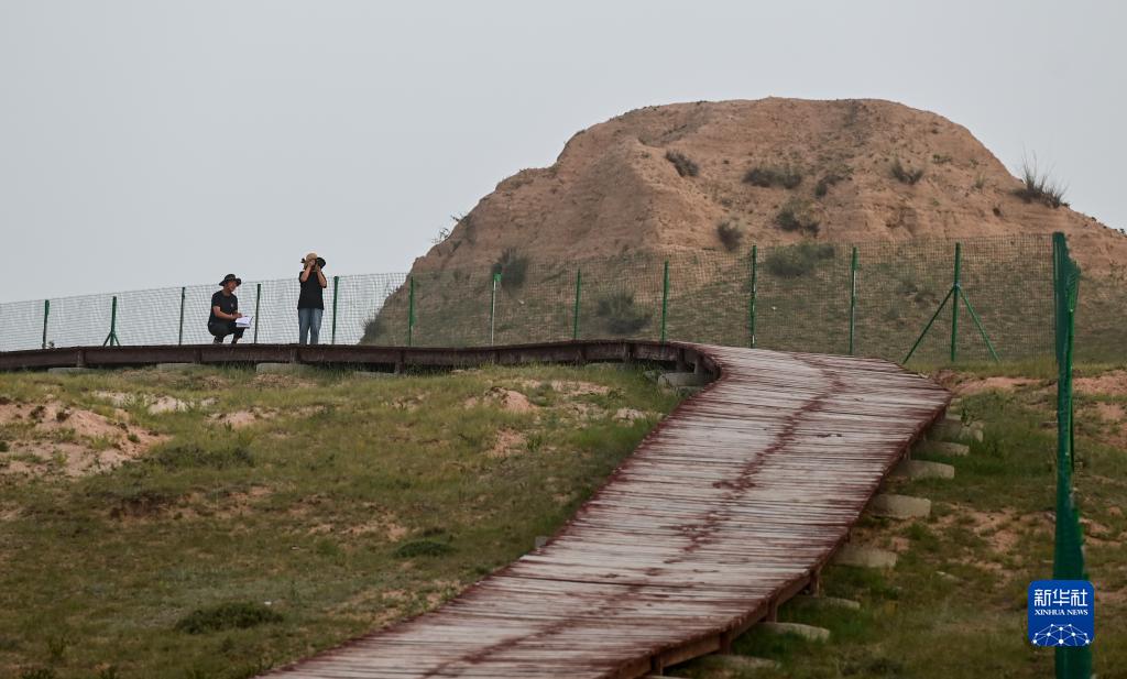 陳靜(右)和丈夫高萬東走在木棧道上觀看拍攝長城(8月16日攝)。