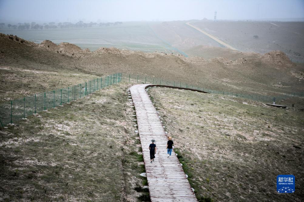 陳靜(右)和丈夫高萬東走在木棧道上觀看拍攝長城(8月16日攝)。近年來鹽池縣建起長城旅游觀光帶,吸引各地游客前來。