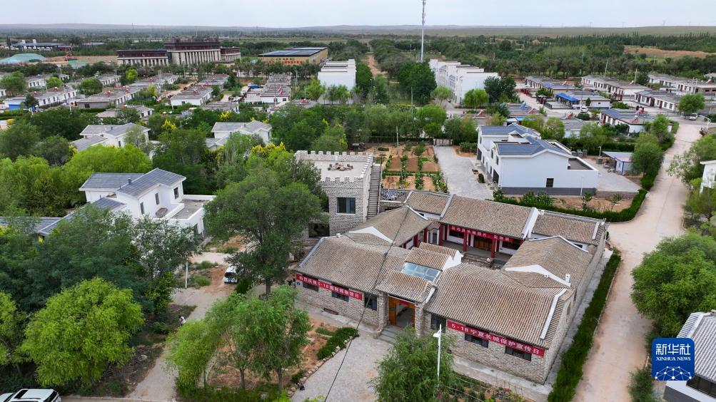 這是8月17日在寧夏鹽池縣長城新村拍攝的鹽池長城民俗博物館,遠處是明長城(無人機照片)。
