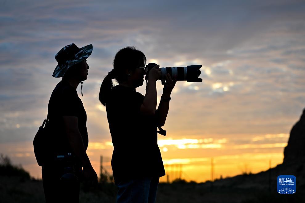 夕陽下,陳靜和丈夫高萬東在拍攝五墩烽火&附近的長城(8月17日攝)。