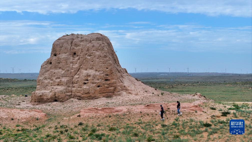 陳靜(右)和丈夫高萬東在瞭馬墩烽火&考察(8月17日攝,無人機照片)。