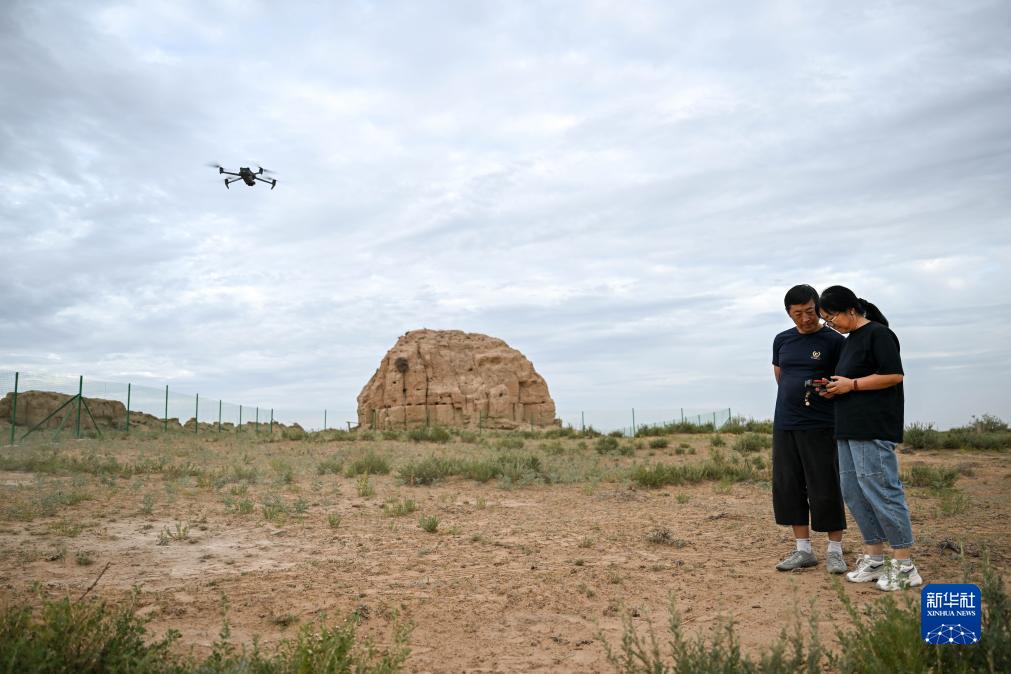 陳靜(右)用無人機航拍五墩烽火&(8月17日攝)。