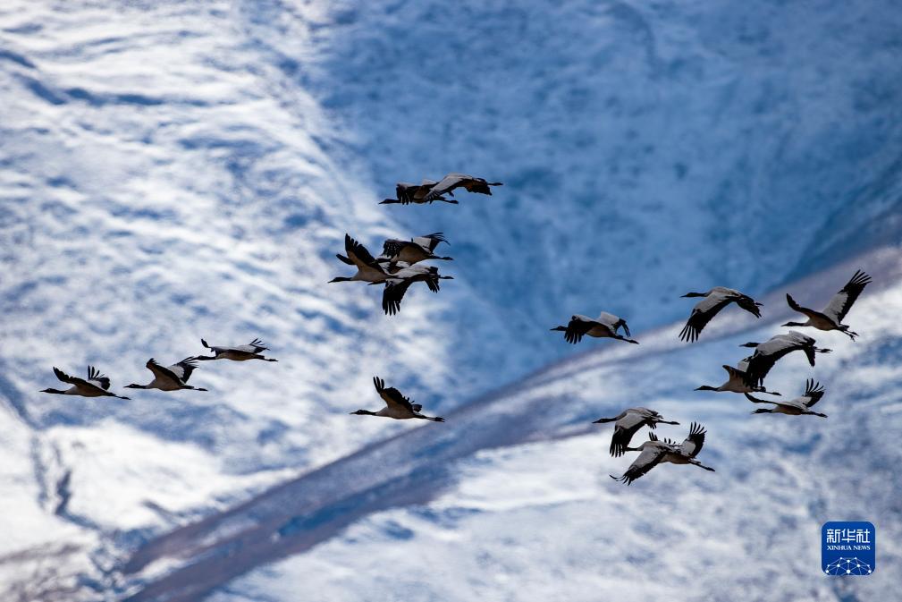12月8日拍攝的拉薩市林周縣境內雪山前飛翔的黑頸鶴。