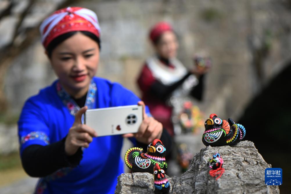12月8日,在貴州省黔東南苗族侗族自治州黃平縣飛雲崖景區,一名游客在拍攝手工製作的泥哨。