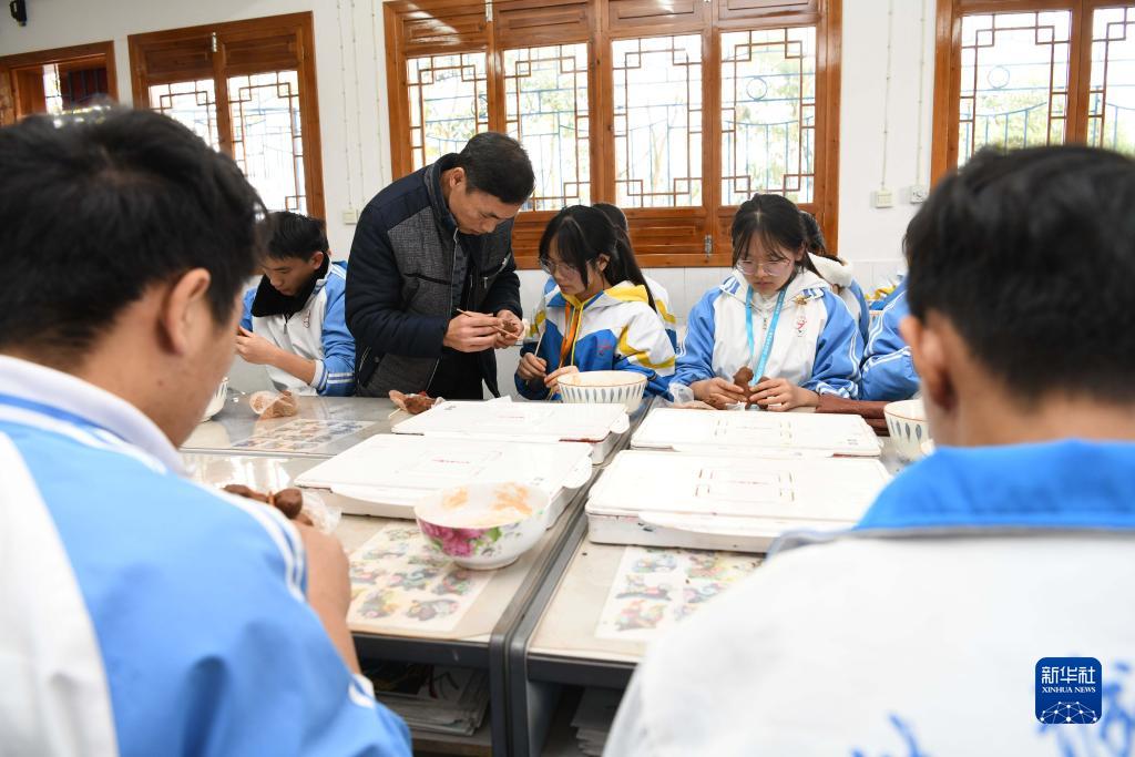 12月8日,在貴州省黔東南苗族侗族自治州黃平縣舊州中學社團活動室,非遺傳承人潘文斌給學生講解泥哨製作技藝。