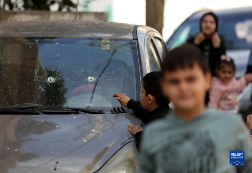 12月8日,在約旦河西岸城市圖巴斯附近一處難民營,兒童查看在衝突中被毀壞的車輛。