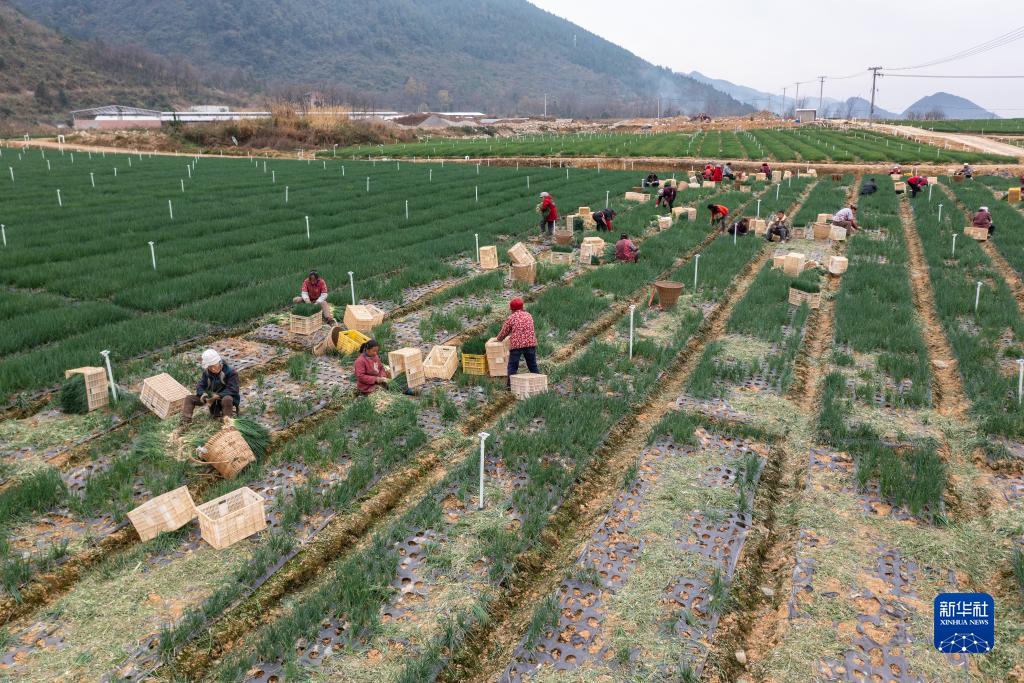 12月8日,在重慶市豐都縣武平鎮壩周村,村民在香蔥共富農場采收香蔥(無人機照片)。