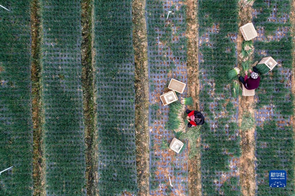 12月8日,在重慶市豐都縣武平鎮壩周村,村民在香蔥共富農場采收香蔥(無人機照片)。