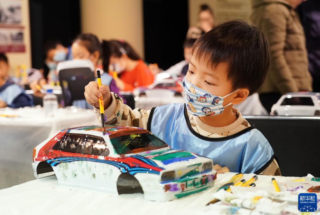 12月9日,小朋友在北京汽車博物館體驗“汽車彩繪”。