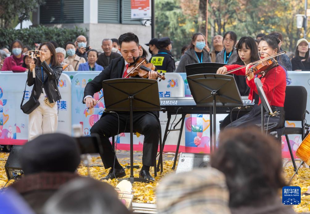 12月9日,青年音樂家們在銀杏樹下演奏音樂。