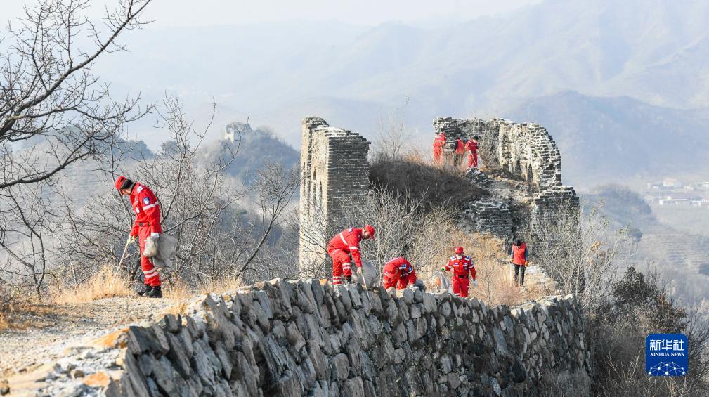 12月5日,志願者在河北省遵化市興旺寨鎮花椒園村古長城撿拾垃圾雜物。