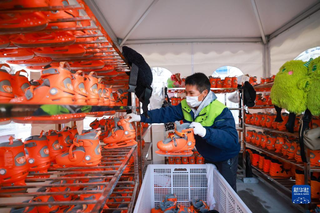 12月9日,工作人員在天津意式風情區馬可波羅廣場露天冰場整理滑冰裝備。