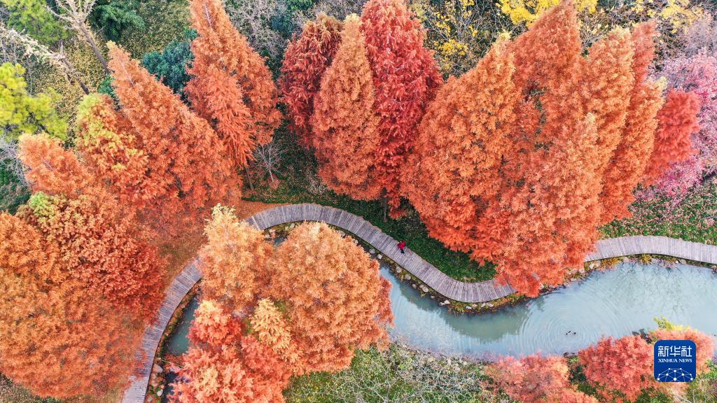 12月9日,市民在江蘇揚州蜀岡-瘦西湖風景區落羽杉林中漫步(無人機照片)。