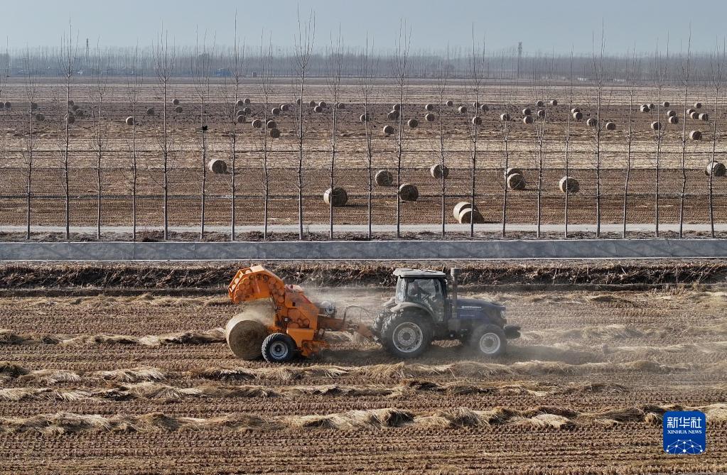 12月10日,在唐山市曹妃甸區第八農場田間,農機手駕駛農機將稻草回收打捆(無人機照片)。
