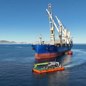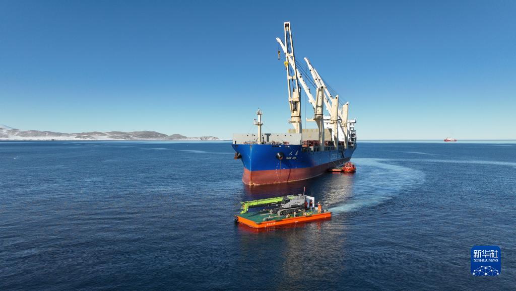 12月8日,“天惠”輪在卸載建站物資(無人機照片)。