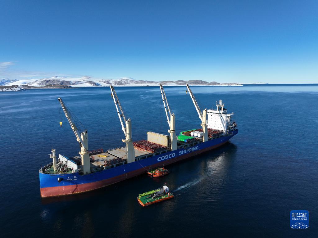 12月8日,“天惠”輪在卸載建站物資(無人機照片)。