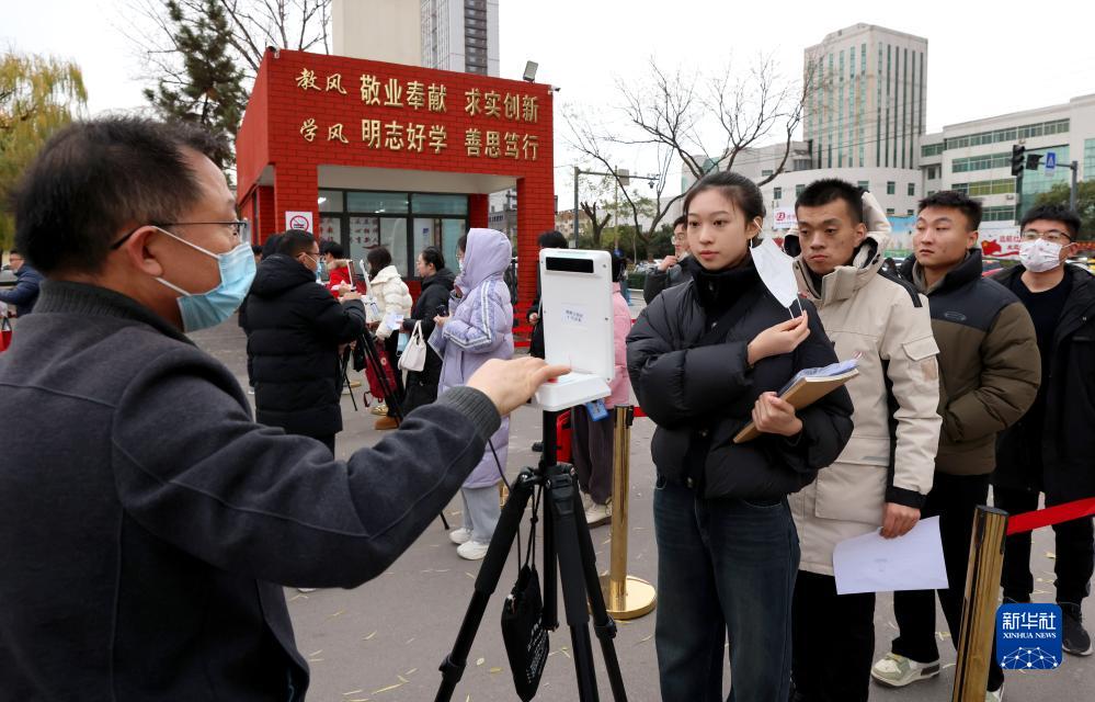 12月10日,在山東省棗莊市第四十一中學南校考點,工作人員在核對考生信息。