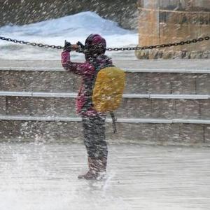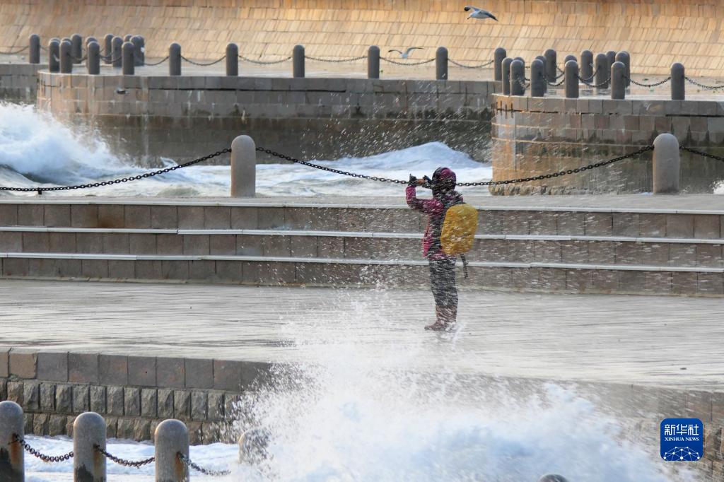 12月10日,一名市民在山東煙&&邊拍攝海浪。