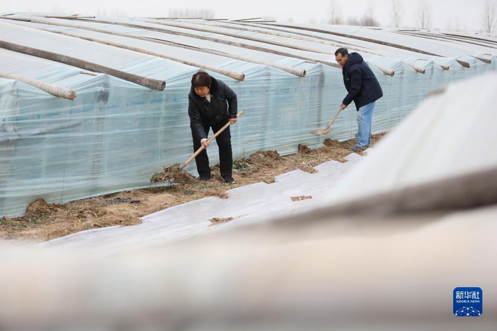 12月10日,在山東省淄博市高青縣黑裏寨鎮雙河村,農民在加固蔬菜大棚抵禦寒潮。