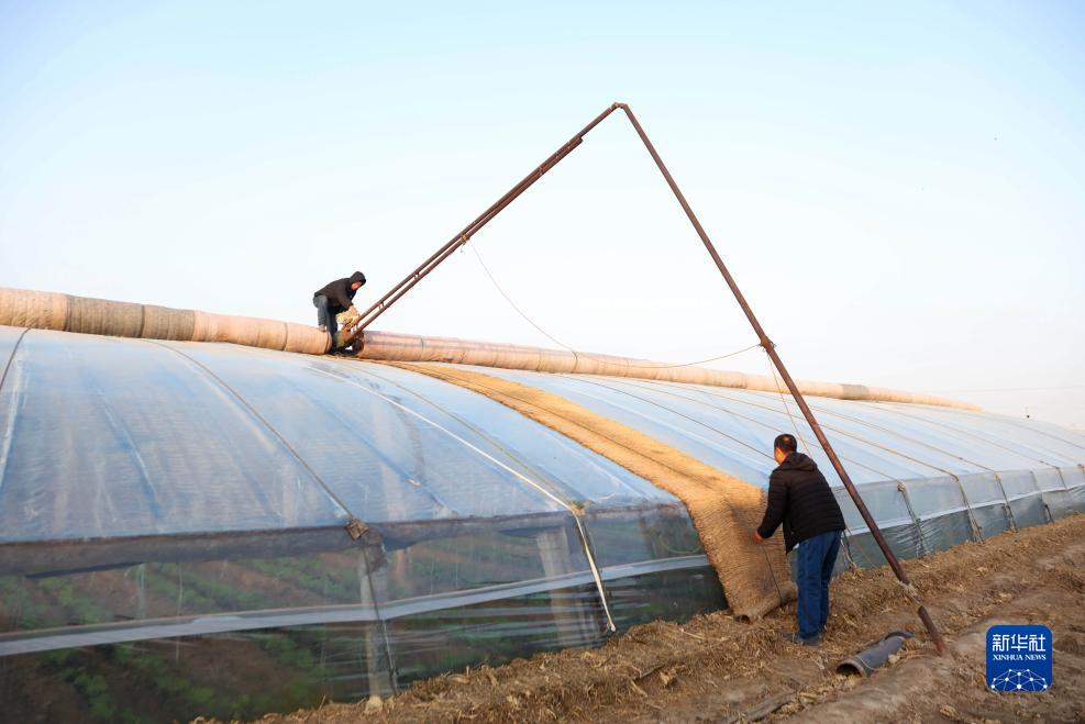 12月10日,在山東省濱州市濱城區楊柳雪鎮一處現代農業示範園區,農民給蔬菜大棚加蓋棉苫。