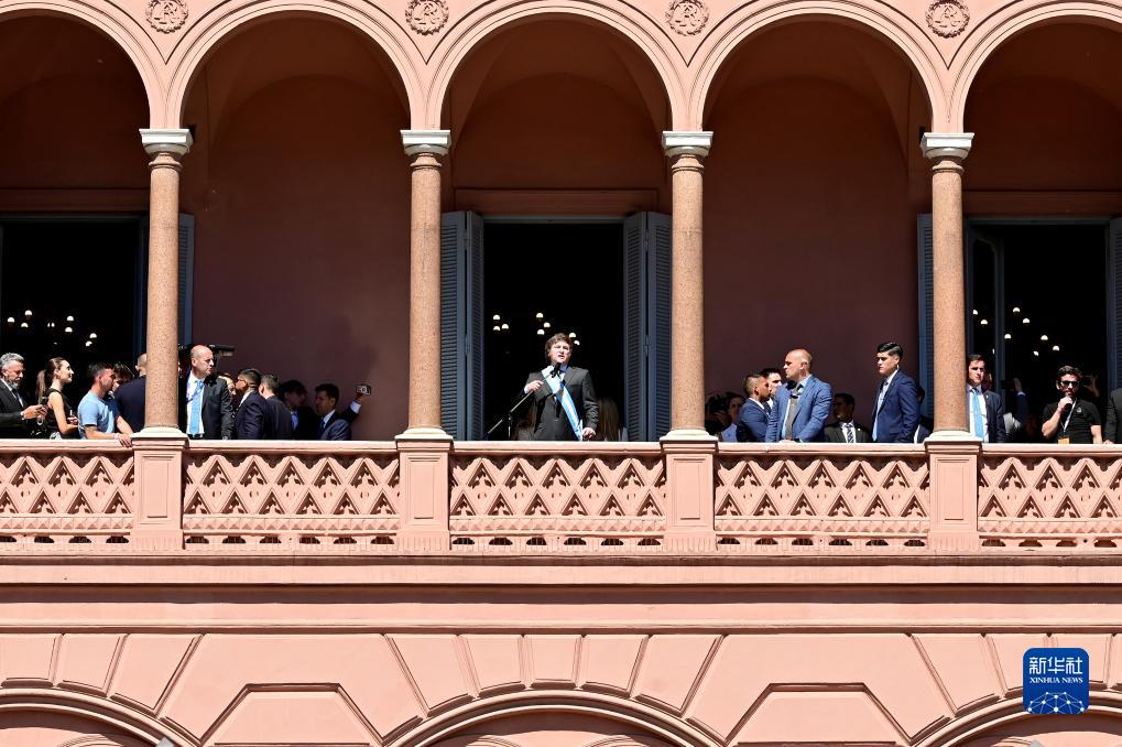 12月10日,在阿根廷首都布宜諾斯艾利斯,阿根廷新總統米萊(中)在總統府玫瑰宮陽&上向民眾發表演説。