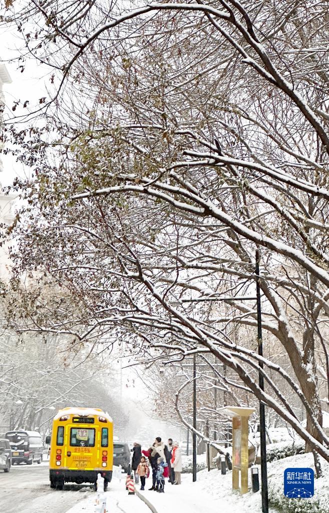 12月11日,在朝陽區,一輛校車在雪中接學生。