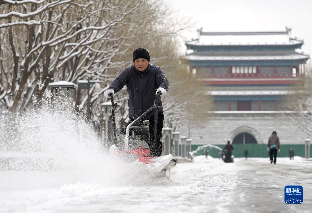12月11日,在永定門公園內,工作人員在清理積雪。