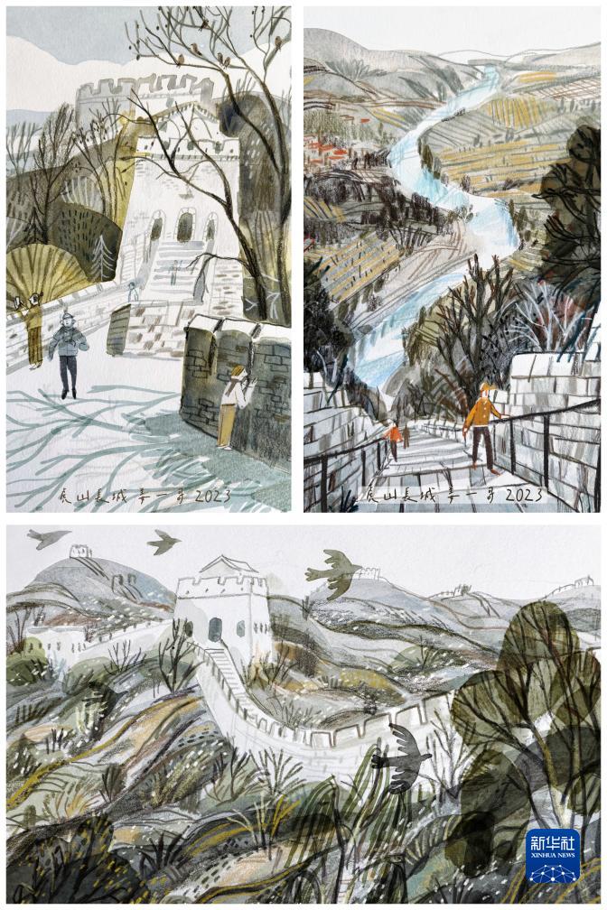 理性、沉穩的虎山長城,與姜一哥感性、靈動的筆觸,交織融合在一幅幅畫作中。在社交平台上,姜一哥的長城畫作引起了很多網友的興趣,她也會在線上分享虎山長城的故事。她説:“希望通過畫作,讓大家看到一個更溫柔、更浪漫、更親切的長城,也讓孩子們深入了解長城的歷史和文化。”